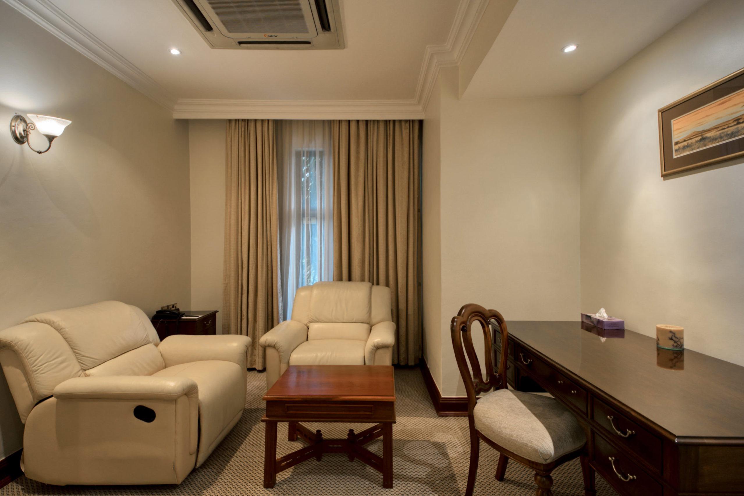 All rooms are clean and spacious with en-suite bathrooms, mini bars fridge, satellite TV plasma, telephones, WI-FI access in all rooms and public areas, data ports, Tea and Coffee making facilities, safe deposit boxes, hair dryers and 24-hour room service. All suites have Jacuzzis.