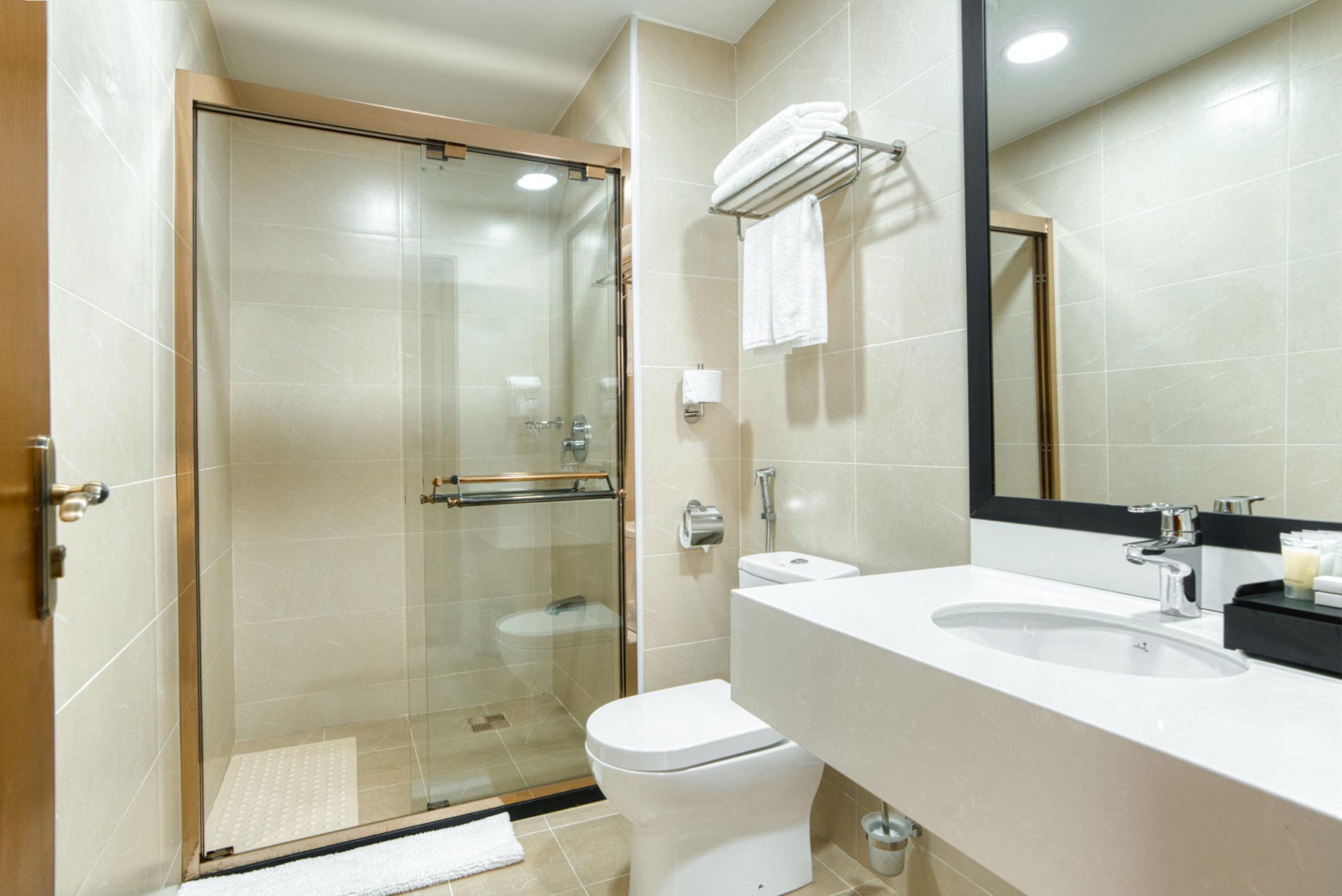 This modern guestroom features two single beds with a contemporary marble bathroom.